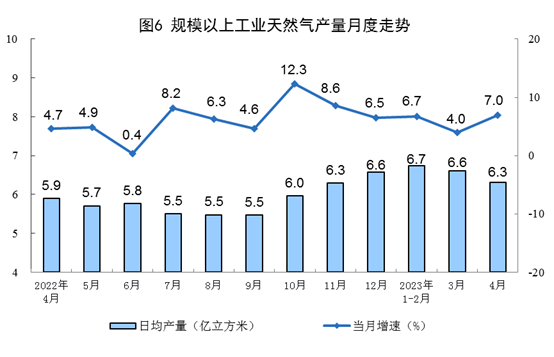 天然氣生產增速加快,進口保持較快增長。4月份,生產天然氣189億立方米,同比增長7.0%,增速比3月份加快3.0個百分點,日均產量6.3億立方米。進口天然氣898萬噸,同比增長11.0%,增速比3月份放緩0.6個百分點。